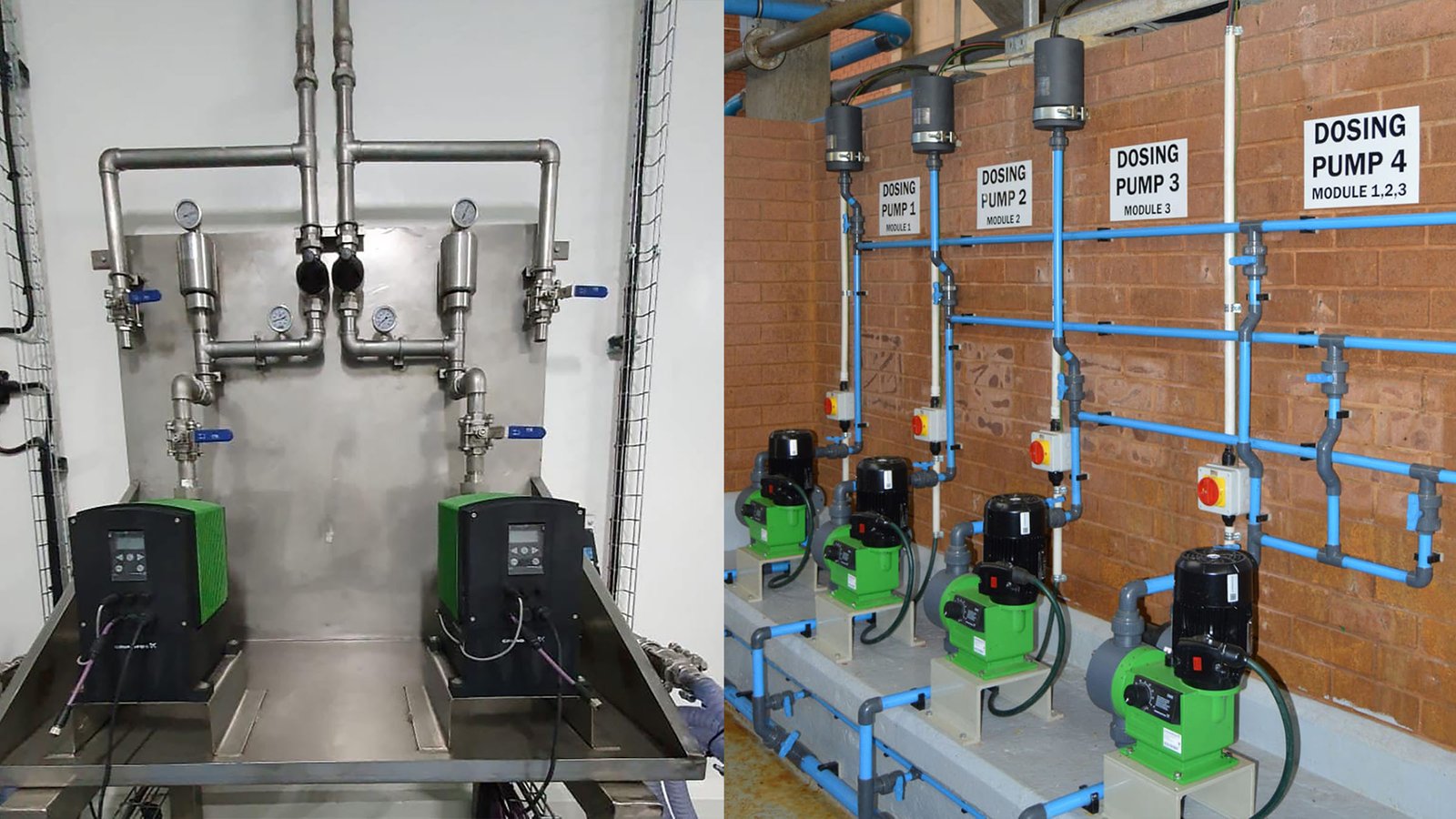 Left: Grundfos DME digital dosing pumps with pulse control were selected for a customer application which requires a pulse-based batch control function with a 940 litre per hour dosing rate, and Right: Grundfos DMX mechanical dosing pumps installed in a major municipal waste water treatment plants for dosing of Ferric Chloride.