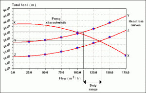 By imposing the pump head/flow curve over the derived system curve, one can subsequently see how the specific pump is going to perform in such a system. Logically, the more precise the system curve represent the dynamic losses over flow, the more accurate the pump performance prediction.